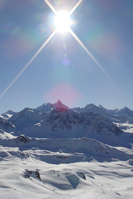 Ez is mutatja, hogy az idővel ismét mázlink volt...egész nap gyönyörű napsütésben száguldoztunk:-) Igen ez az igazi Wallis (Valais)...csúszol a 2m-es havon, előtted délre a 4000m-es csúcsok, köztük a Matterhorn...